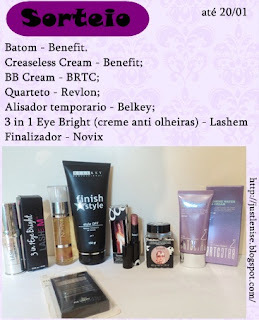 Sorteio de um kit contendo Batom Passionista; Creaseless Cream; BB Cream; 3 in 1 Eye Brint - Lashem; Quarteto de Sombras Sultry Smoke - Revlon; Alisador Temporário - Bellkey; Finalizador - Novix.